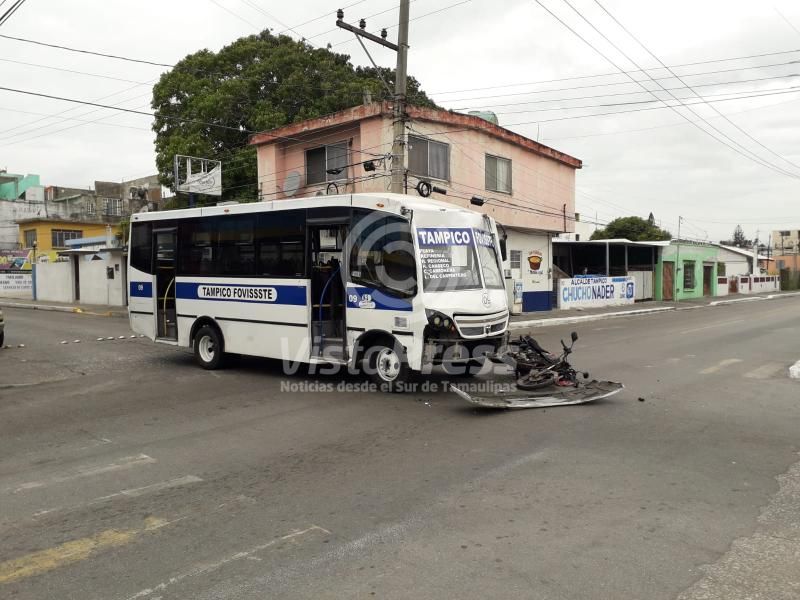 El encontronazo se presentó a las 8 de la mañana del viernes en la calle José de Escandón vialidad con la calle Olmos de la zona centro de Tampico. Las unidades involucradas son un microbús de la ruta Tampico Fovissste y una moto en color negro con rojo.