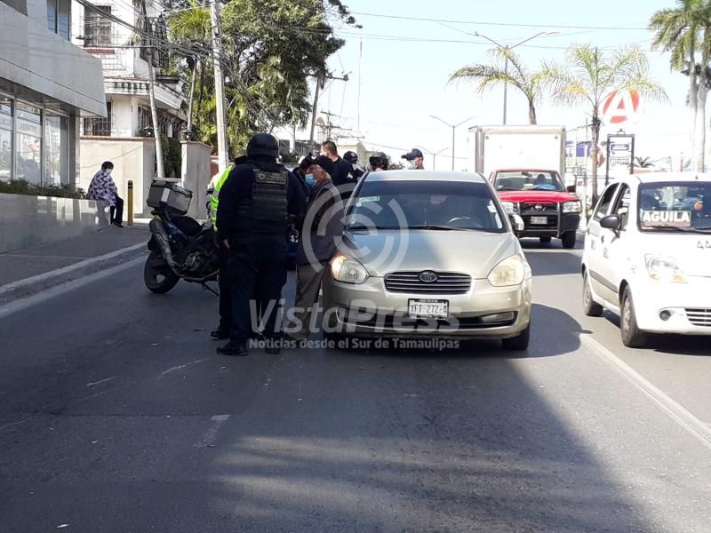 Tampico, Tam.- Un motociclista perdió uno de sus dientes al impactarse en la parte trasera de un carro, mientras saque su acompañante resultó con algunos golpes