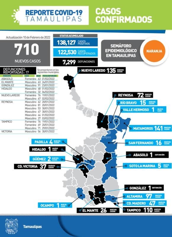 Secretaría de Salud de Tamaulipas confirmó 710 nuevos casos durante las últimas 24 horas y 17 fallecimientos por COVID-19 en pacientes con comorbilidades, por lo que exhortó a mantener el control de las enfermedades crónicas no transmisibles.