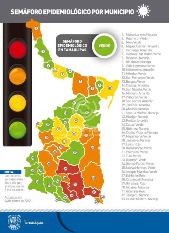 Tamaulipas avanzó a semáforo de riesgo epidemiológico color verde, informó la Secretaría de Salud al presentar el reporte diario sobre el estado de la pandemia.
