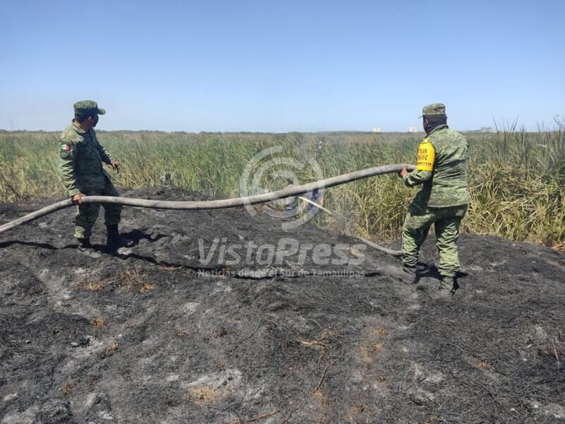 Tampico, Tam.- A bordo de un vehículo Freightliner, 17 elementos del Ejército Mexicano entraron en apoyo a las acciones de emergencia para controlar el incendio registrado, ahora en Ciudad Madero, informó la Sedena.