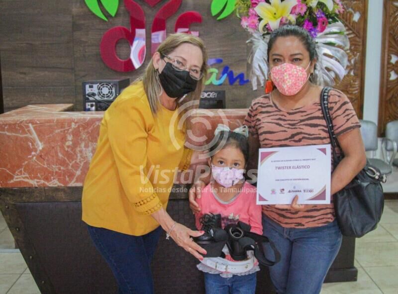 Bajo ese contexto, Danna Sofia Mar Matamoros, residente de la colonia Guadalupe Victoria recibió de manos de la titular del DIF un twister elástico, mientras que Yuliana Sarai López Hernández fue beneficiada con otro twister elástico para su padecimiento de pie plano, de igual forma Dania Ximena Moctezuma Zapata recibió un twister con manguera para su padecimiento de pie equino.