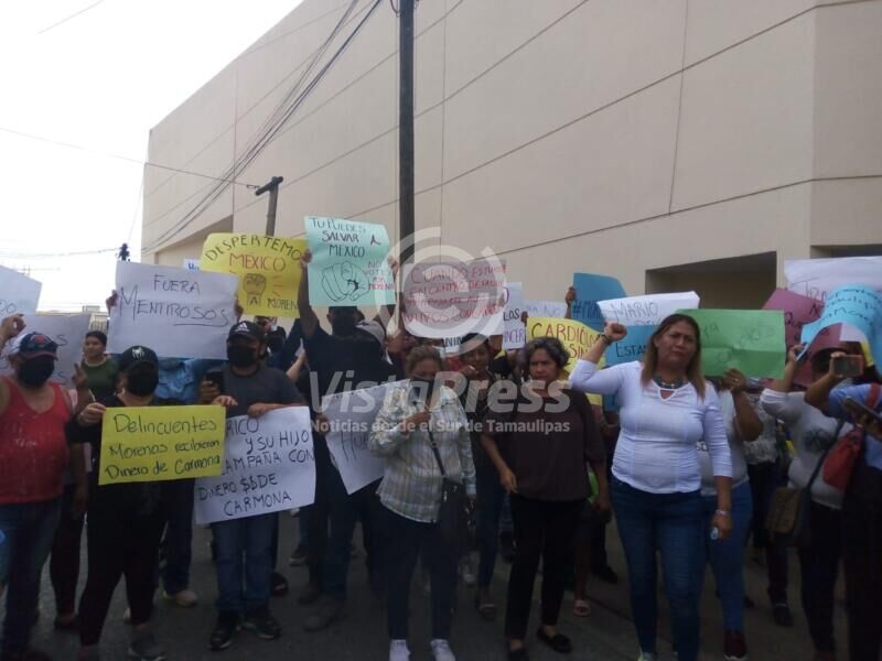 Tampico.- Al grito de «Fuera Morena», «Fuera Américo», «Fuera Mario Delgado», «Fuera los huachicoleros de Morena», la mañana de este miércoles decenas de personas protestaron afuera de un hotel donde el candidato de la coalición»Juntos Haremos Historia», Américo Villarreal Anaya y Mario Delgado, líder nacional de Morena, ofrecían una rueda de prensa a medios de comunicación locales.