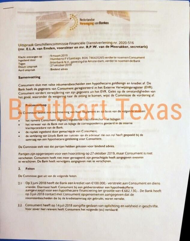 «Los documentos revelaron que Villarreal Santiago obtuvo un préstamo de $100.000 euros (aproximadamente 105.600 dólares) en Interbank NV en Ámsterdam con documentos «falsificados» y luego trató de obtener un préstamo hipotecario por 682.139 euros (aproximadamente 720.000 dólares) mientras reclamaba ingresos de sólo 1.300 euros (aproximadamente 1.300 dólares) al mes», indica Breitbart.