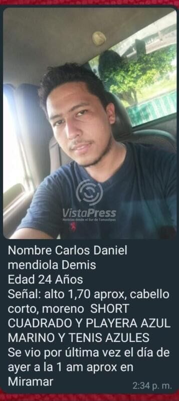 De acuerdo a lo informado respondía al nombre de Carlos Daniel Mendiola Demis de 24 años de edad, mismo que ya era buscado por sus familiares, quienes aseguraron que la última vez fue visto en la playa Miramar el lunes por la madrugada.