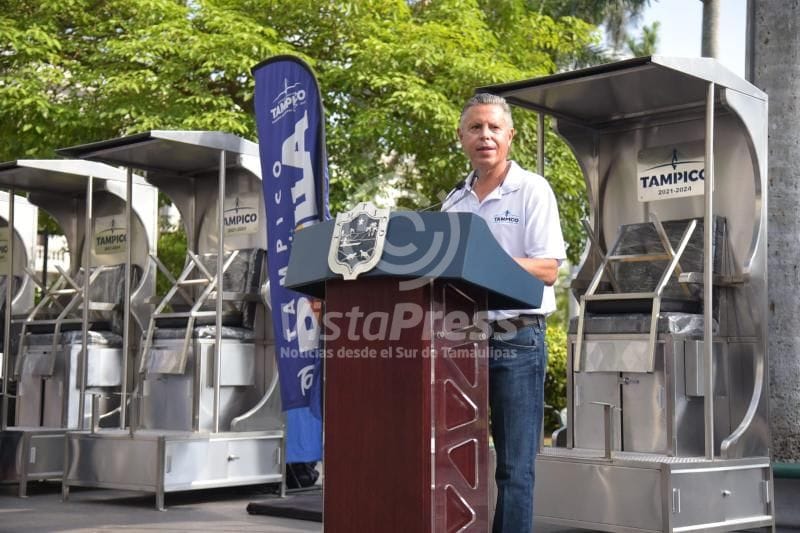 Tampico, Tan.- Al reconocer la importante contribución histórica y turística de los boleros en el desarrollo de Tampico desde hace un siglo, el Presidente municipal Chucho Nader encabezó, este lunes, la entrega de 37 modernos módulos para el aseo de calzado que serán instalados en las plazas de Armas y Libertad.