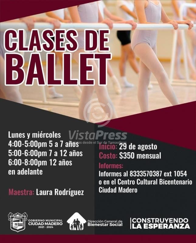 Explicó que las clases de ballet iniciarán el 29 de agosto y estarán dirigidas a niños de 5 a 7 años, 7 a 12 años y adolescentes de 13 años en adelante, en horarios de 4 a 5 de la tarde, 5 a 6 de la tarde y de 6 de la tarde a 8 de la noche, los días lunes y miércoles, a cargo de la maestra Laura Rodríguez.