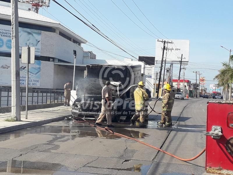 Tampico, Tam.- Una camioneta cargada con hielo terminó por ser consumida por las llamas tras incendiarse a causa de un corto circuito.