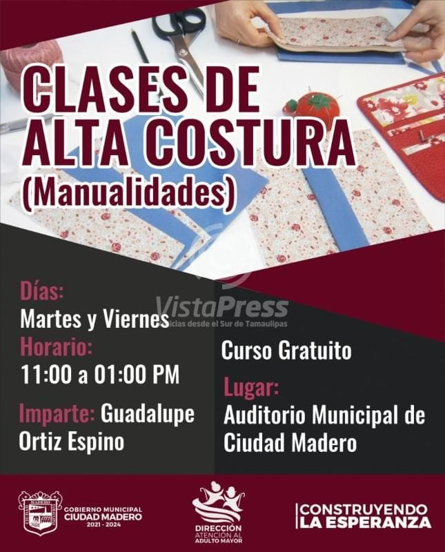 Al respecto, Alejandra Calderón Ávalos, titular de la dependencia, informó que a partir de esta semana inició un curso gratuito de alta costura, el cual se lleva a cabo los días martes y viernes de once de la mañana a una de la tarde en el Auditorio Municipal de Ciudad Madero y es impartido por la profesora Guadalupe Ortiz Espino.