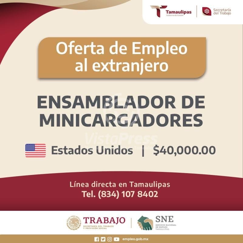 Igualmente, dentro de las plazas laborales se difundió una vacante laboral de ensamblador de mini cargadores con sueldo neto mensual de 40 mil pesos en Estados Unidos, conocimientos de uso de maquinaria industrial, automotriz y manufactura.