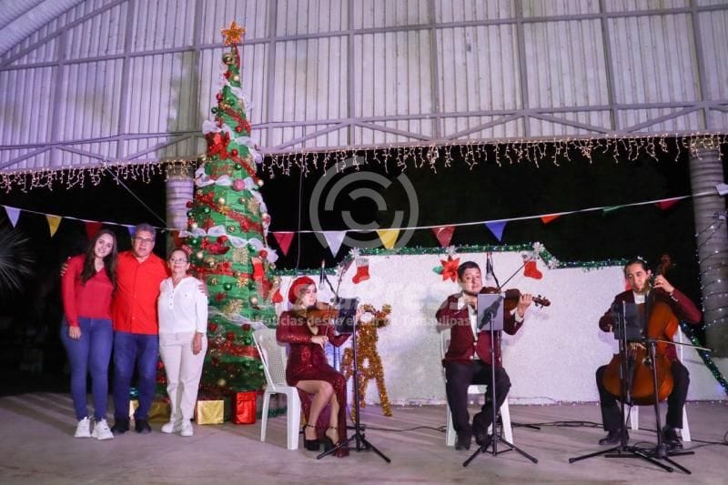 Altamira, Tamaulipas.- Un extraordinario programa cultural enmarcó el encendido del árbol de Navidad del ejido Esteros en Altamira, acto que fue encabezado por el presidente municipal, Mtro. Armando Martínez Manríquez y su esposa, la C.P. Rossy Luque de Martínez, presidenta del Sistema DIF local.