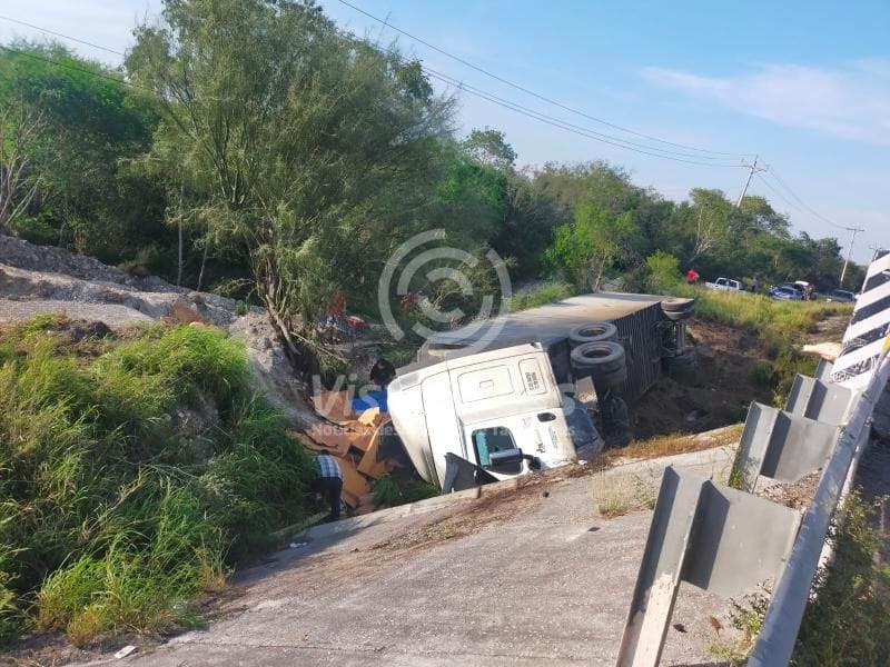 Reynosa, Tamaulipas.-Personal de la Guardia Estatal destacamentado en el municipio de Reynosa brindó apoyo carretero al conductor de un tráiler que se volcó a un lado de la carpeta asfáltica en la Carretera Federal 97 a la altura del kilómetro 21.