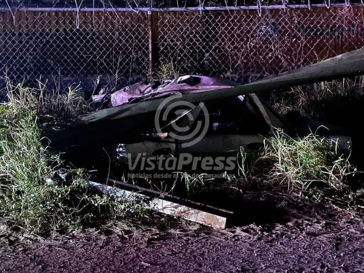 A un costado del camino quedó totalmente destrozado el vehículo Nissan Tsuru color blanco con franja verde de la base de taxis Guch, vehículo que se presume era conducido a exceso de velocidad y al tomar una curva el conductor perdió el control del volante.