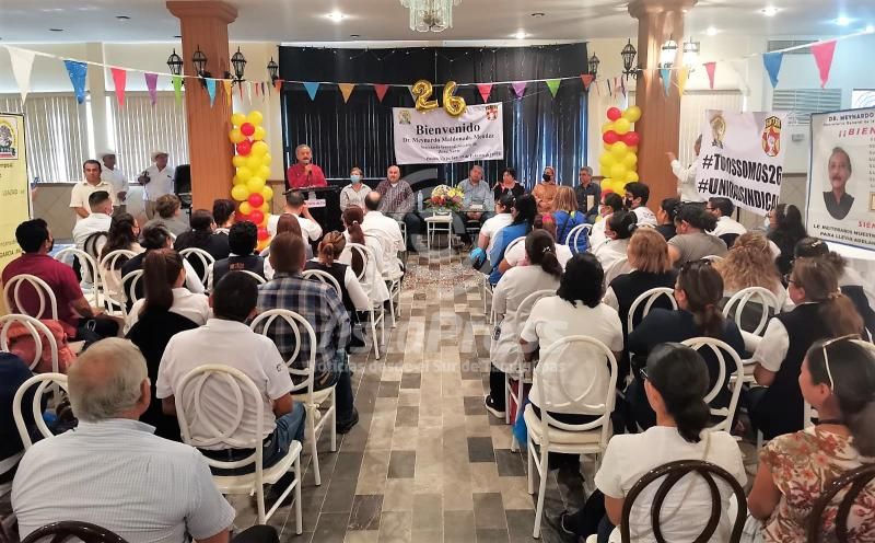 El líder sindical, médico Meynardo Maldonado Méndez, secretario general del SNTSA Sección 26 Zona Norte, mencionó en su mensaje que en el proyecto de federalizar los servicios de salud, son aliados del presidente de México.