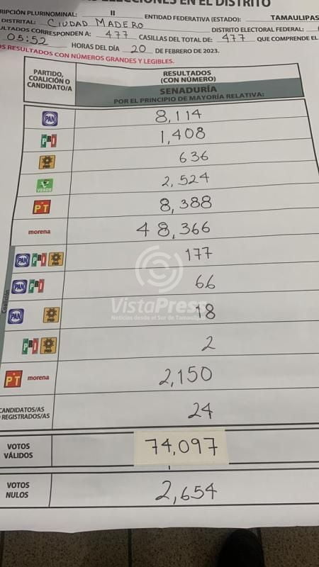 De acuerdo a cifras del Instituto Nacional Electoral, la información arrojada del sistema tras el cómputo de las actas de la pasada elección extraordinaria, en el Distrito Electoral Federal número 7, que comprende los municipios de Altamira y Madero, MORENA obtuvo 48 mil 366 sufragios (PT-MORENA 2 mil 150 votos; PT 8 mil 388 votos), contra los 8 mil 114 del PAN (en coalición PAN-PRI-PRD, 177 votos; PAN-PRI 66 votos; PAN-PRD 18 votos; PRI 1, 408 votos; PRD 636 votos; PRI-PRD 2 votos), mientras que el Partido Verde de México solo obtuvo 2 mil 524 sufragios.