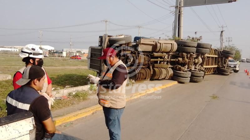 Altamira, Tam.- Un tráiler terminó volcado hacia el Puerto Industrial de Altamira, luego de que al dar vuelta en «U» le gana la carga.