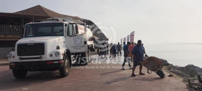 Madero, Tam.- Como parte de los preparativos para recibir a los turistas en el próximo periodo vacacional de Semana Santa, el Gobierno de Ciudad Madero lleva a cabo la limpieza de playa Miramar, uniéndose a estas acciones artesanos y vendedores ambulantes que se ubican en el área de las Escolleras.