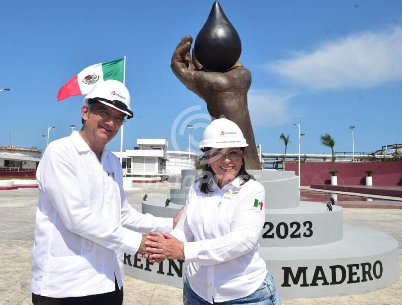 El presidente López Obrador estuvo acompañado de la secretaria de Energía, Rocío Nahle García y del director de Pemex, Octavio Romero Oropeza, para efectuar una reunión de evaluación de los trabajos que llevarán a este centro refinador, a producir a fin de año, 160 mil barriles diarios de petróleo.