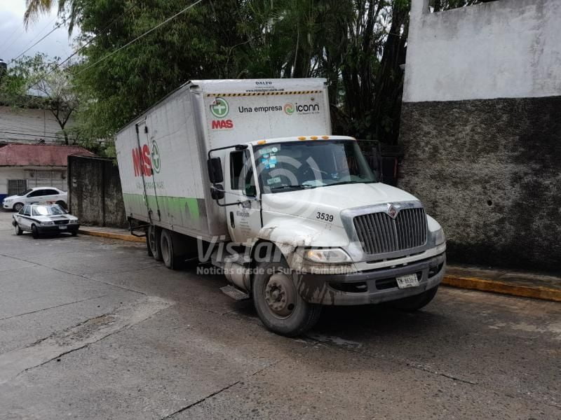 Tempoal, Ver.-Un camión de la empresa Más + termino con daños materiales y afectaciones a una barda, luego de sufrir una falla mecánica en una pendiente de la zona centro de la ciudad.