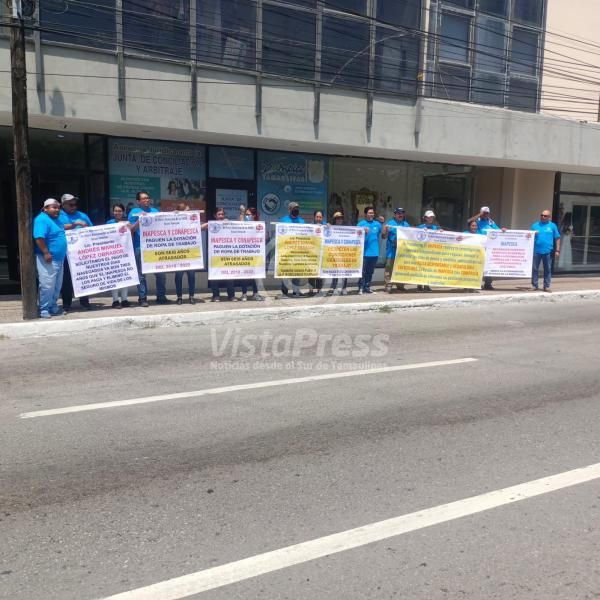 Tampico.- Trabajadores de Pesca y Acuacultura, Sección Tamaulipas armaron este lunes la primera de una serie de manifestaciones que harán para exigir al Gobierno Federal de pongan al corriente con los pagos que tienen atrasados con ellos y para pugnar porque no se fusionan la Inapesca y Conapesca pues dice esa Unión afectará a los que allí trabajan así como al sector pesquero.