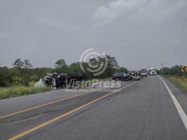 San Fernando, Tam.- Derivado del choque de un automóvil y un tráiler que transportaba vehículos de una empresa particular a la altura del kilómetro 13 del Libramiento San Fernando, dos personas, una mujer y un hombre perdieron la vida y una menor con lesiones leves fue trasladada para recibir atención médica en el Hospital General de San Fernando.