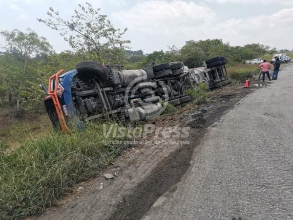 Pueblo Viejo, Ver.-Una pipa que transportaba 33,500 litros de diesel, terminó por volcarse saliéndose de la carpeta de rodamiento.