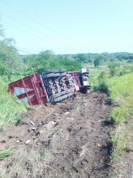 La unidad cargada con varias toneladas de trigo a granel circulaba sobre la carretera federal 127 Alazán – Canoas en el tramo Tempoal – El Higo, pero al salirse de la carpeta asfáltica a la altura del Rancho Monte Líbano, la pesada unidad volcó tras caer aún desnivel.