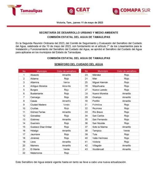 De acuerdo a lo establecido en la Segunda Reunión Ordinaria del año 2023, del Comité de Seguimiento y Evaluación del Semáforo del Cuidado del Agua, celebrado el día 10 de mayo del mismo año, con fundamento en el artículo 7º. de los Lineamientos para la Instalación y Funcionamiento del Semáforo del Cuidado del Agua, este se aprobó para aplicarse en los municipios de Tamaulipas.