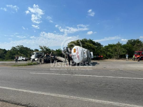 Altamira, Tam.- La volcadura de una pipa que transporta gasolina movilizó a los cuerpos de emergencias, luego de que se pensaba que está contenía combustible; el conductor resultó ileso.