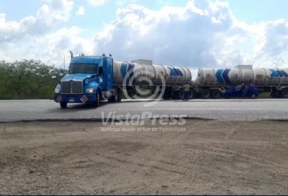 Pueblo Viejo; Ver.-Un auto compacto terminó impactándose contra el costado de una de las dos pipas que era trasladada por un tráiler, cuyo conductor realizó una imprudente vuelta en » U», cerrándole el paso para dar lugar al percance en el que por fortuna no se registraron personas lesionadas.