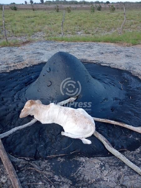 En las imágenes se observan a las reses sumergidas hasta el cuello y aunque no se ha confirmado por alguna autoridad municipal, todo parece indicar que se trata de una emanación de hidrocarburo.