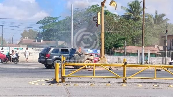 Pánuco, Ver.-Una vagoneta terminó envuelta en llamas, luego de que su conductor se impactará contra la base de un semáforo.