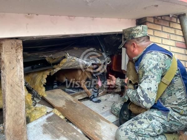 rescate de los sobrevivientes. Cabe resaltar que “ECKO” y “JUPITER” son los caninos navales especializados en búsqueda y localización que se suman con el equipo USAR-MARINA para efectuar los rescates de las familias afectadas.