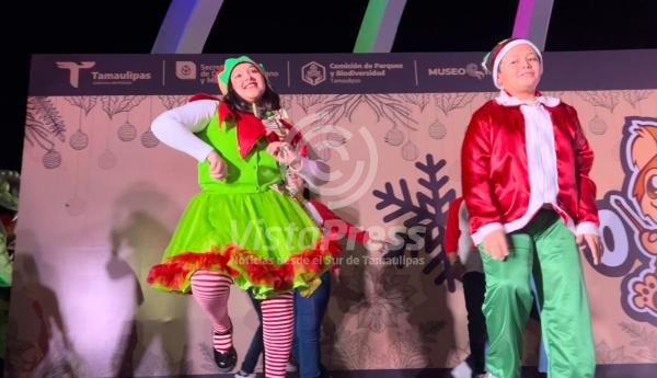 Ciudad Victoria, Tamaulipas. – Con una velada navideña espectacular, organizada por la Comisión de Parques y Biodiversidad de Tamaulipas (CPBT), Santa Claus entregó regalos a las niñas y niños que se dieron cita en la explanada del Museo Tamux, donde presenciaron el encendido del “Dino Navideño “ y disfrutaron el concurso de villancicos y vestuario.