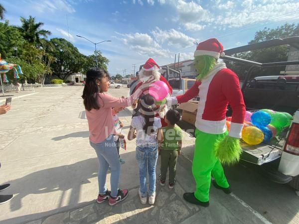 González, Tamaulipas.- Con el propósito de entregar regalos y dulces a los niños y niñas del municipio de González, personal de la Guardia Estatal escoltó al Grinch y a Santa Claus.