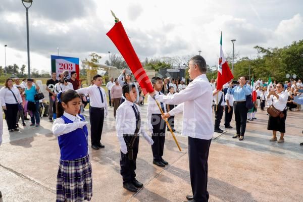 Durante el acto cívico, el mandatario abanderó, además a las escoltas de 14 planteles de educación básica.
