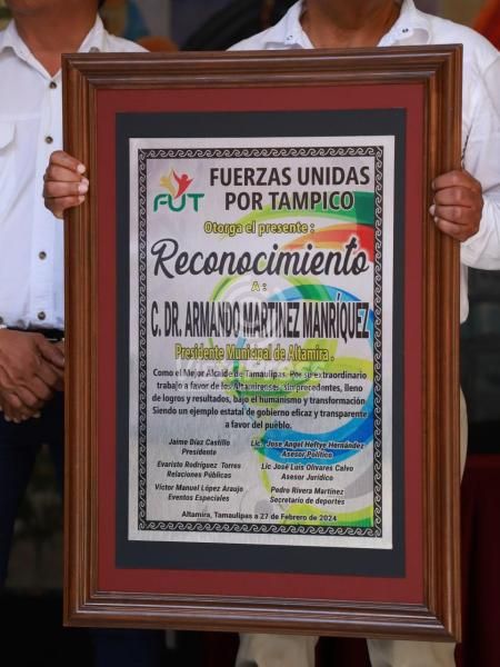 Teniendo como marco el patio central del palacio municipal, el presidente de Fuerzas Unidas por Tampico, Jaime Díaz Castillo, hizo entrega de esta distinción al presidente municipal, Dr. Armando Martínez Manríquez, por su extraordinario trabajo en favor de los altamirenses, mediante un actuar humanista siendo un ejemplo estatal de gobierno.