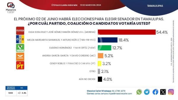 Ciudad Victoria.- Con una preferencia electoral del 54.4% la fórmula de morena al senado integrada por Patricia Sosa Ruiz y José Ramón Gómez Leal encabeza las preferencias ciudadanas en Tamaulipas para ganar de manera contundente y arrasadora las elecciones el próximo 2 de junio de 2024 de acuerdo a una encuesta publicada por Massive Caller, siguen en segundo lugar la fórmula integrada por los candidatos del PRI, PAN y PRD con 18.4% y en tercer lugar aparece la fórmula del Partido Verde con 12.7%.