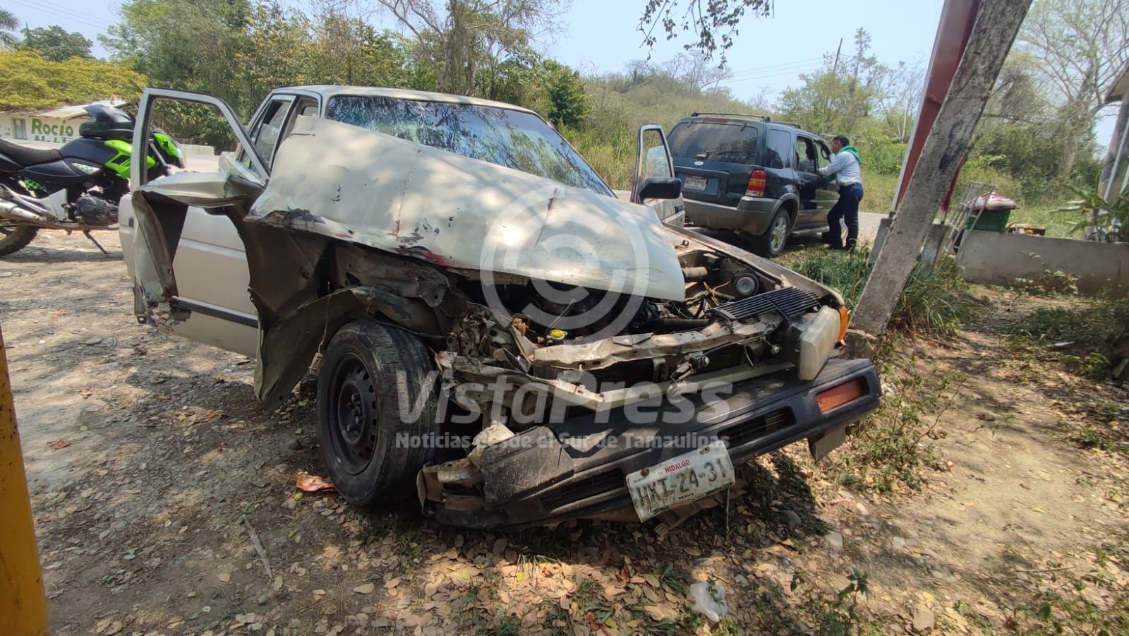 En ese punto quedó destrozado y fuera de la cinta asfáltica el automóvil marca Nissan tipo Tsuru color arena, y placas del estado de Hidalgo.