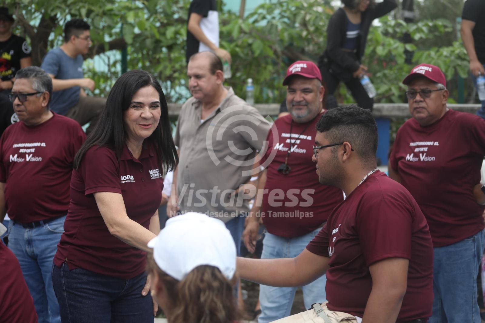 La candidata fue la encargada de hacer el saque inicial del partido de exhibición de básquetbol, que realizaron los integrantes del club «Jaibos Tampico».