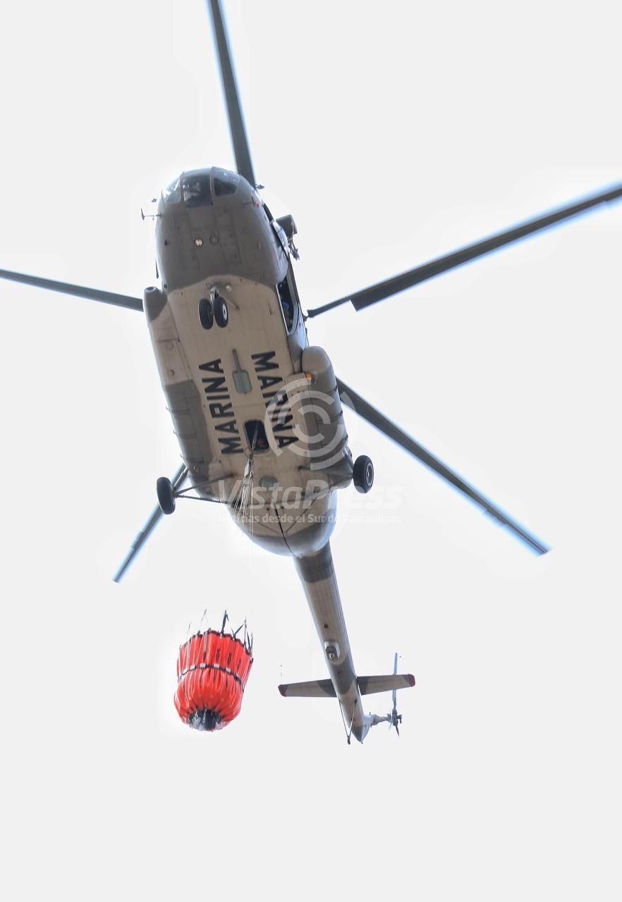 Ciudad Victoria, Tamaulipas.- El helicóptero MI-17, enviado por la Secretaría de Marina para combatir el incendio forestal en El Cañón del Novillo, comenzó su trabajo esta mañana y a lo largo del día se prevé realizará hasta 25 viajes, descargando en cada vuelo 2,500 litros de agua.