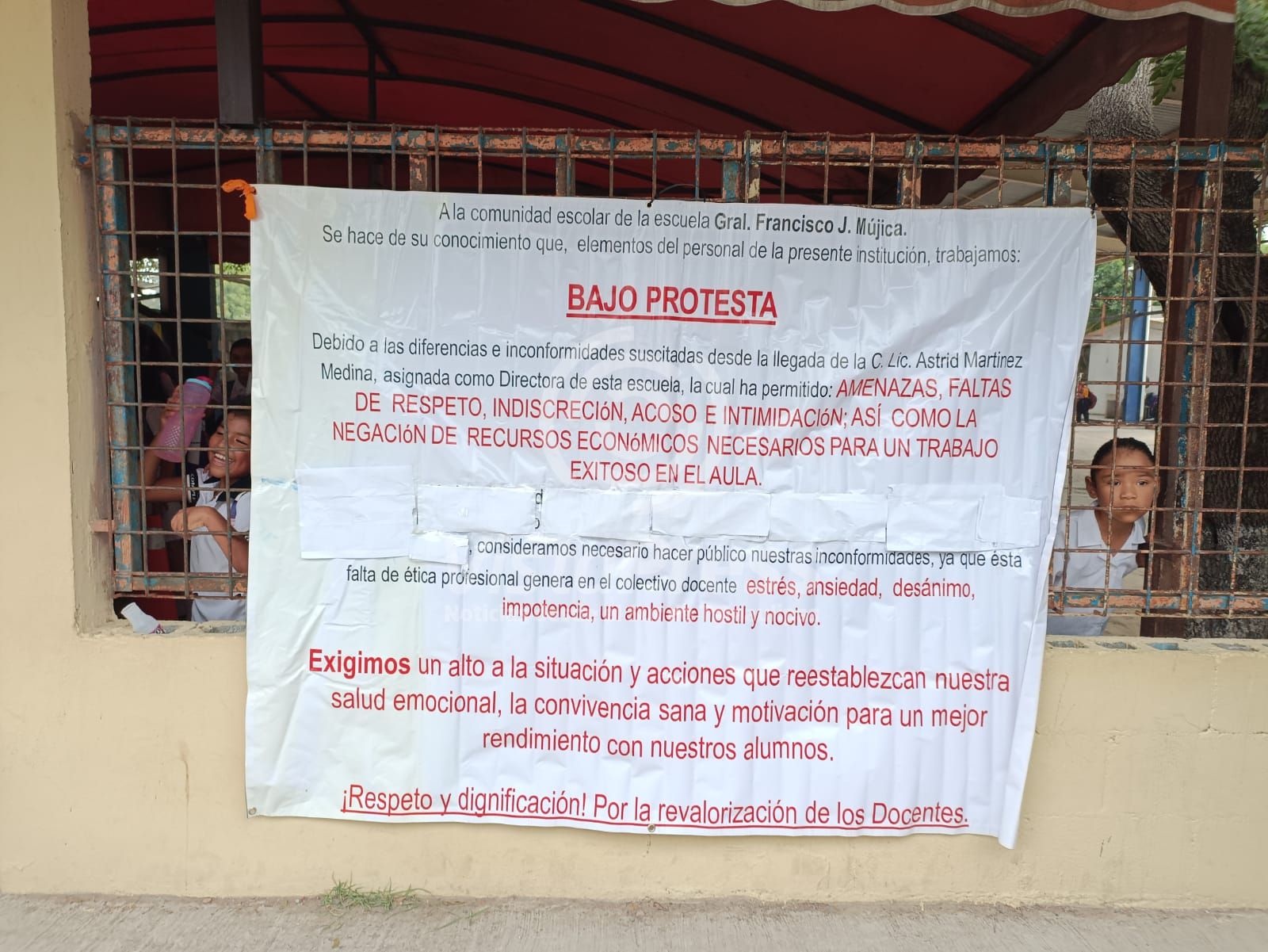 Por su parte una de las maestras, quien solicito el anonimato, dijo que la directora Astrid Martínez, desde su llegada a la escuela, hace dos años, «se comporta de una manera muy grosera con nosotros, no tiene manera tratar a las personas y no sabe trabajar en equipo, por eso colocamos una manta a las afueras del plantel donde le informamos a la sociedad que estamos trabajando bajo protesta».