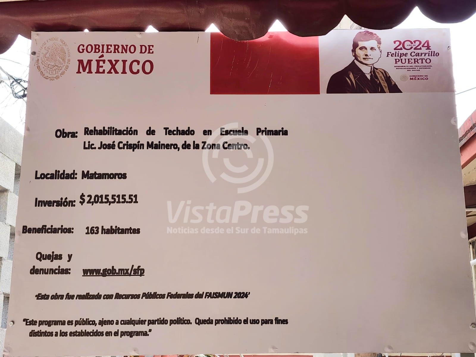 Gracias al Fondo de Aportaciones para la Infraestructura Social Municipal y de las Demarcaciones Territoriales del Distrito Federal (Faismun) hoy se construye una nueva techumbre en la Escuela Primaria «José Crispín Mainero» en Matamoros, una obra que costará dos millones de pesos y que beneficiará a poco mas de doscientos alumnos que alberga éste plantel.