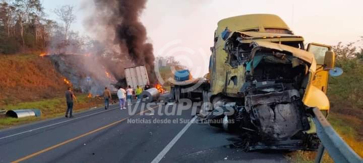 Tamiahua Ver.- La colisión de tres tráilers, provocó el incendio de dos de ellos, además una de las enormes » moles», originó un incendio de pastizal. Desafortunadamente una persona quedó sin vida.