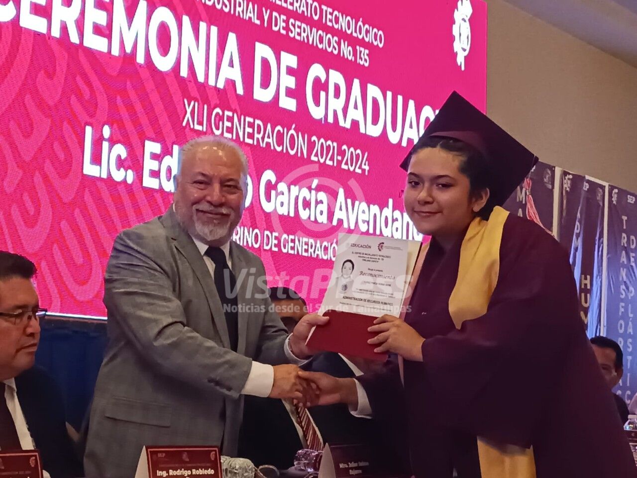 La generación de estudiantes hizo entrega de un reconocimiento al padrino de la generación, Licenciado Eduardo García Avendaño, así como al director del Cbtis 135, maestro Rolando Cortés Delgado.