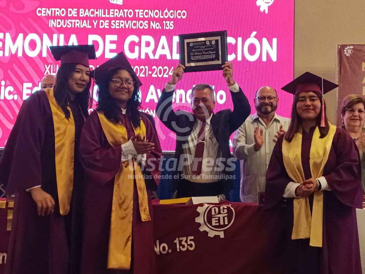 Y en su mensaje a los 921 graduantes, dijo sentirse orgulloso de ellos, «porque a través de sus estudios y grupos de para-escolares, pusieron muy en alto al Cbtis 135, Matamoros y a todo Tamaulipas».