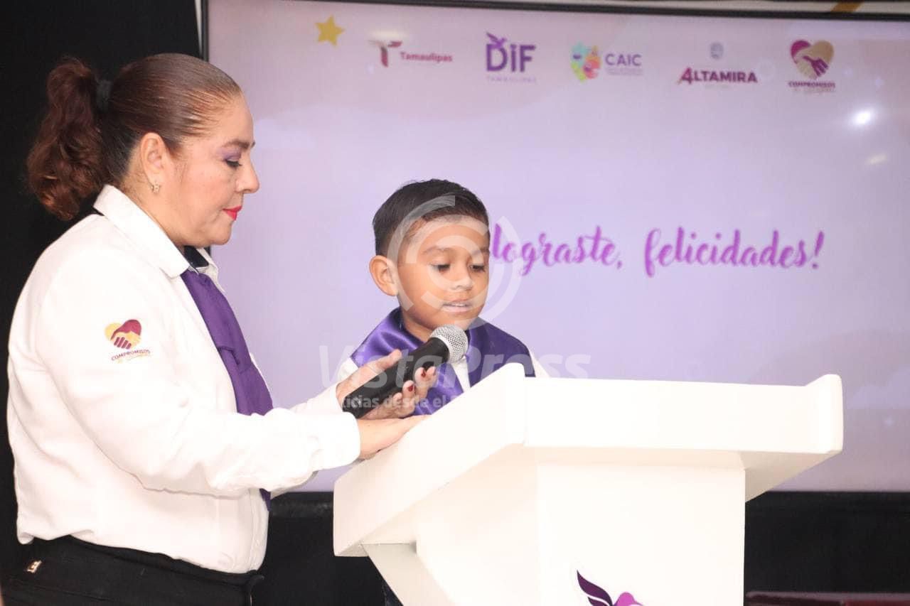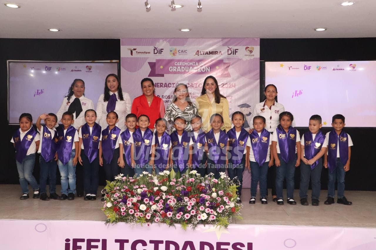Altamira, Tam.-En un marco de entusiasmo, alegría y emotividad, el Sistema para el Desarrollo Integral de la Familia (DIF) en Altamira, que dirige la C.P. Rossy Luque de Martínez, se vistió de gala para conmemorar la graduación de la generación 2021 – 2024 de los niños y niñas que se instruyen en los Centros de Atención Infantil Comunitario (CAIC).