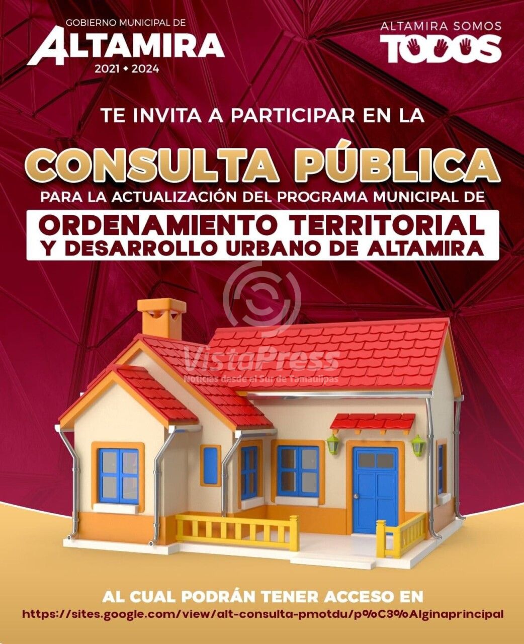 Altamira, Tam.-El R. Ayuntamiento de Altamira, que dirige el alcalde Dr. Armando Martínez Manríquez, hace extensiva la invitación a la comunidad de esta ciudad y puerto a ser partícipes de la consulta pública para la actualización del Programa Municipal de Ordenamiento Territorial y Desarrollo Urbano, misma que se encuentra organizando la Dirección de Desarrollo Urbano, que dirige el Arq. José Tomás Medrano Mayorga.