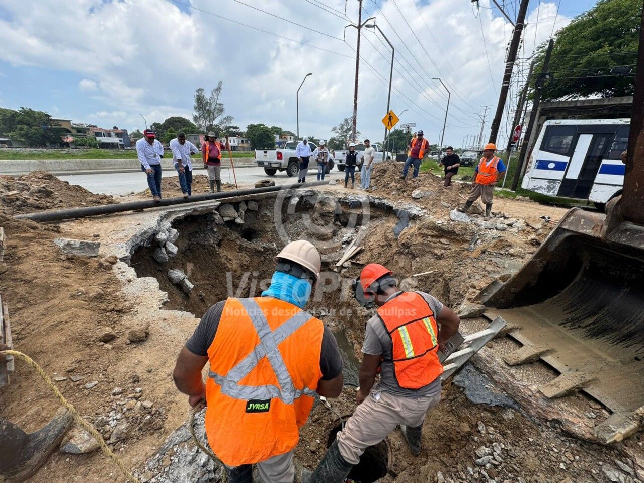 El hundimiento se registró en la Avenida Monterrey, esquina con calle Primera de la colonia Enrique Cárdenas González de la zona norte de Tampico, en donde el colector colapsó debido al tiempo de servicio.