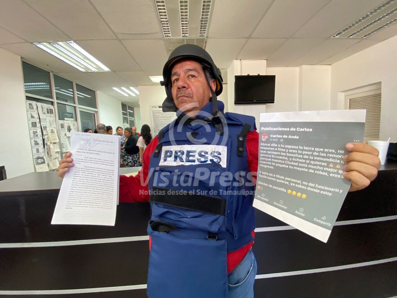 Rubio Curiel acudió a presentar la denuncia vistiendo un chaleco antibalas y un casco táctico, pues afirma temer por su integridad física, e incluso responsabilizó a los dos imputados por lo que llegue a pasarle a él, a su familia, a sus trabajadores y a los periodistas del Club de Periodistas Bravos.